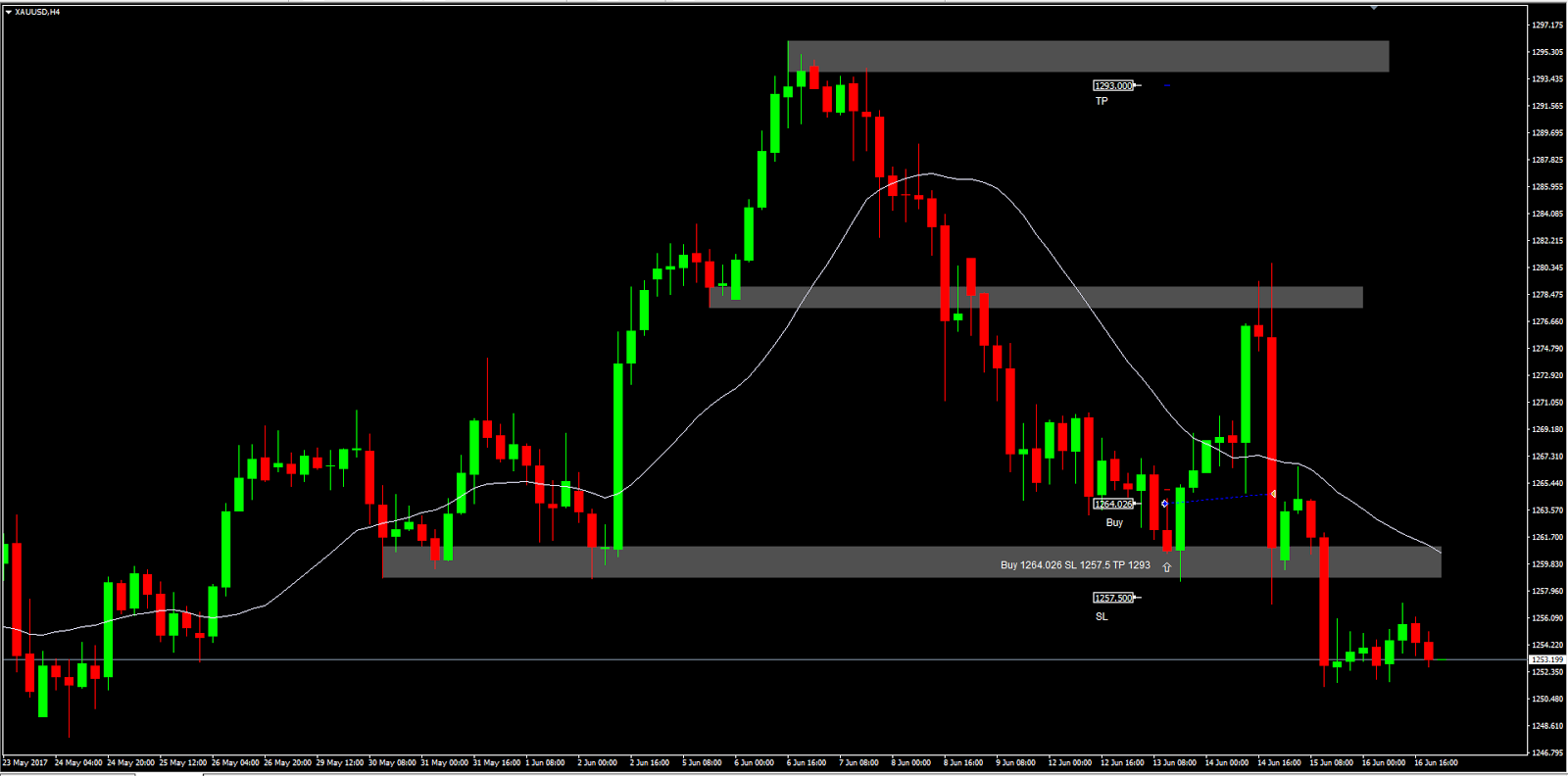 XAUUSD was testing its support area on the H1 chart and formed a bullish morning star candle supported by bullish divergence between price and MACD when I made this trade. I entered short on 13 Jun 2017 at 1264.026. The trade was up by more than 2R after a long bullish candle when I raised my SL to breakeven + 1 just before I went to bed. I was expecting XAUUSD to move further up to my TP target because of the long bullish candle. Instead the trade was stopped out at 1264.72 on 15 Jun 2017 while I was asleep for a more or less a breakeven trade of +0.05%.